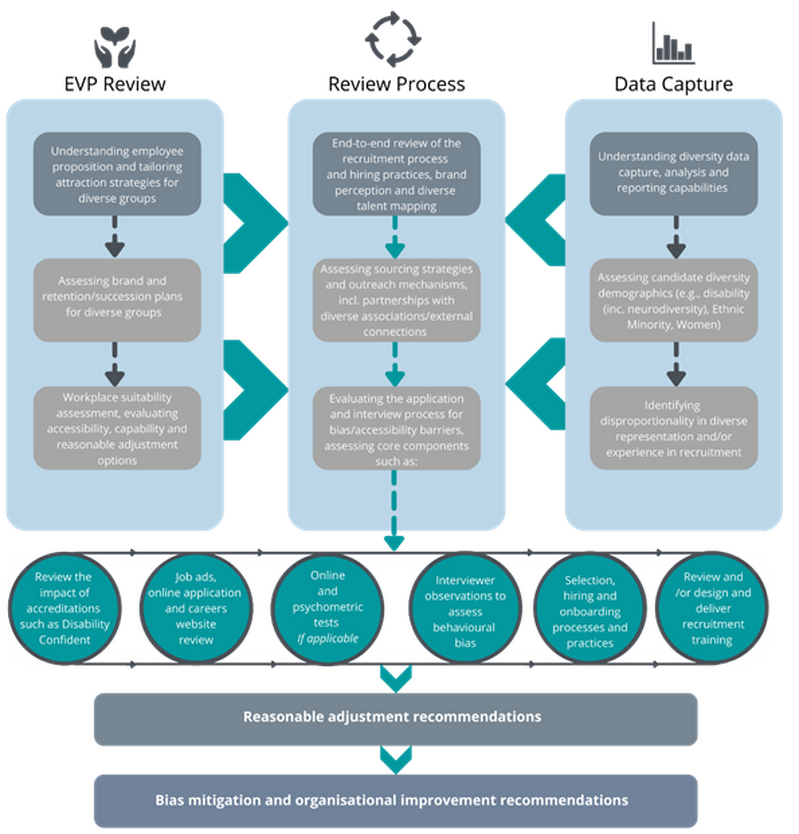 Using a tried and tested best practice methodology we help clients to understand the candidate experience through a range of diverse personas and pinpoint where the greatest drop-off points exist by diverse groups. Our review focuses on any bias present in behaviours, systems, and processes. A typical End-to-End Recruitment Review would include: